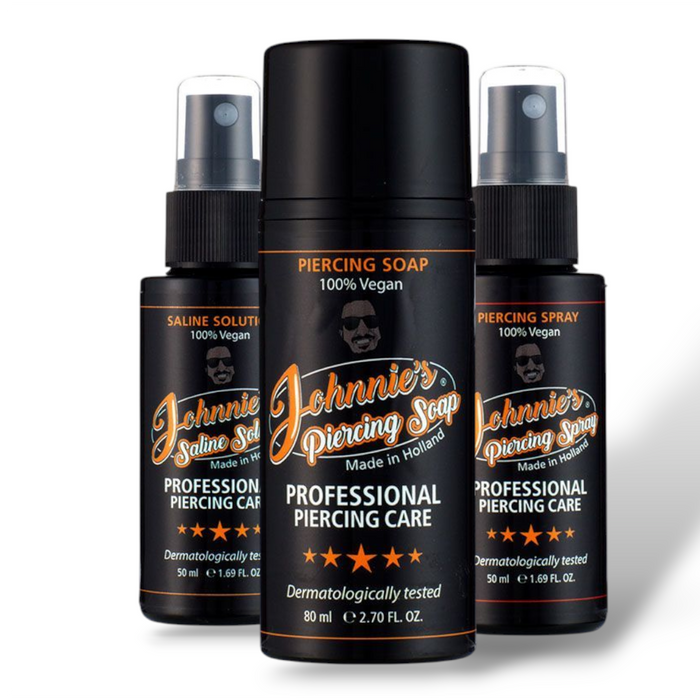 Kit de cuidado para piercings Johnnie's® | Solución salina, spray protector y jabón