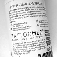El espray para después de perforaciones TattooMed® ofrece una protección antibacteriana óptima y promueve la cicatrización. Este producto de cuidado, especialmente desarrollado, proporciona una limpieza intensiva tanto de la piel perforada como de las joyas. El espray es indoloro y llega incluso a las zonas más difíciles de alcanzar. Su uso regular ayuda a prevenir olores desagradables e infecciones.